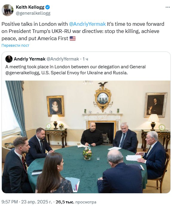 Соответствующий пост Келлог опубликовал в соцсети X, тэгнув пост главы Офиса президента Андрея Ермака, в котором руководитель украинской делегации в Лондоне сообщил о встрече со спецпредставителем Трампа.
