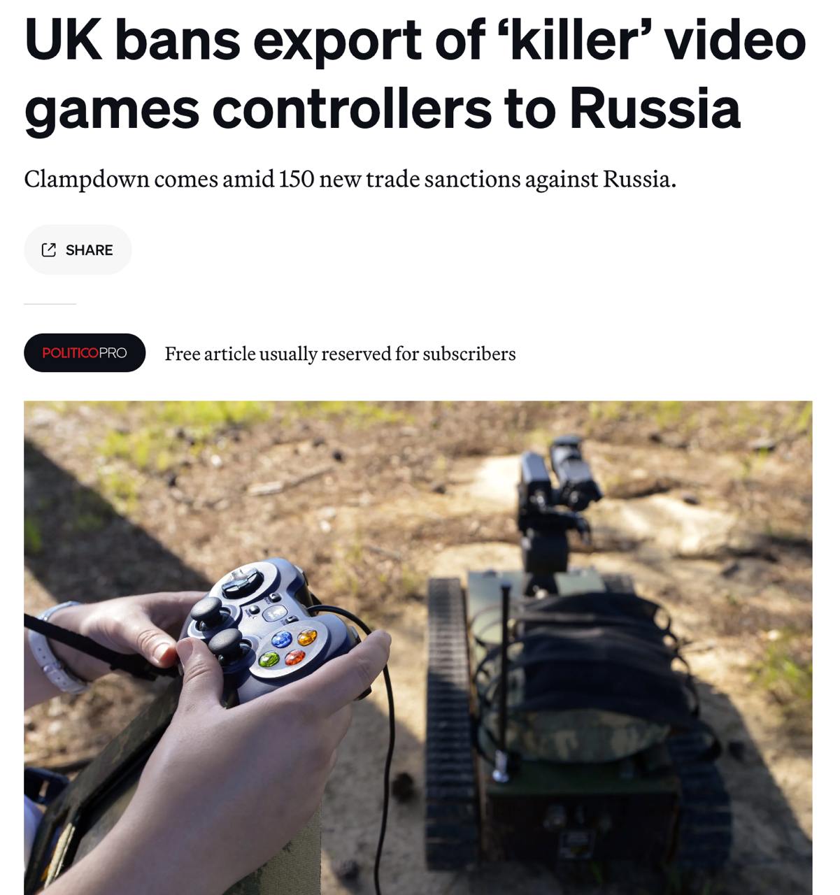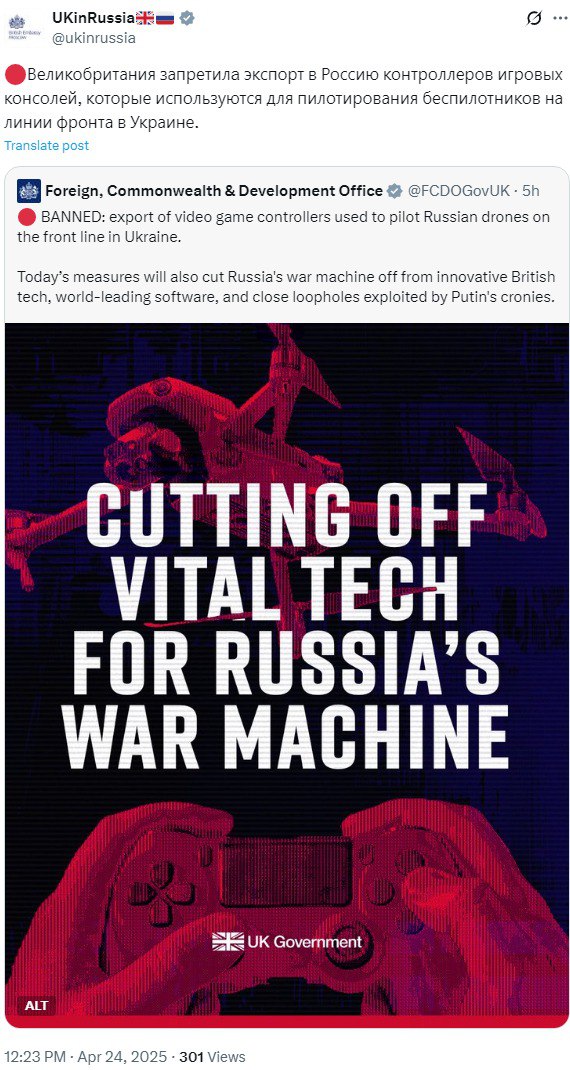 "Великобритания запретила экспорт в Россию контроллеров игровых консолей, которые используются для пилотирования беспилотников на линии фронта в Украине", – говорится в сообщении.