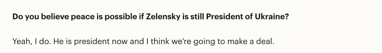 На вопрос Time: "Верите ли вы в возможность мира, если Зеленский останется президентом Украины?" Трамп ответил: