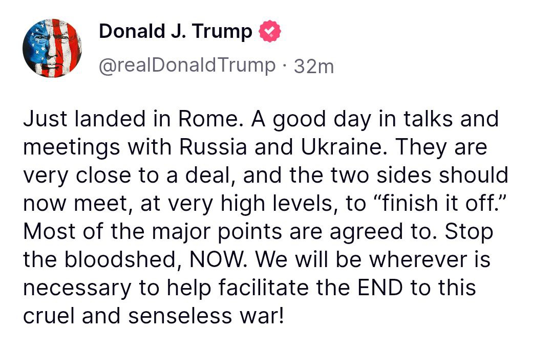 В настоящее время он уже прилетел в Рим на похороны папы римского Франциска. Также там планируются переговоры и встречи с представителями официального Киева и Москвы по вопросу прекращения войны.
