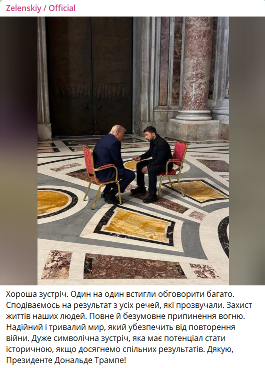 "Хорошая встреча. Один на один успели обсудить многое. Надеемся на результат из всех прозвучавших вещей. Защита жизней наших людей. Полное и безусловное прекращение огня. Надежный и длительный мир, который обезопасит от повторения войны. Очень символическая встреча, имеющая потенциал стать исторической, если достигнем общих результатов. Спасибо, Президент Дональд Трамп!", - написал Зеленский.