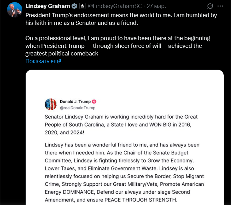 Сенатор-республиканец Линдси Грэм. Фото: Х