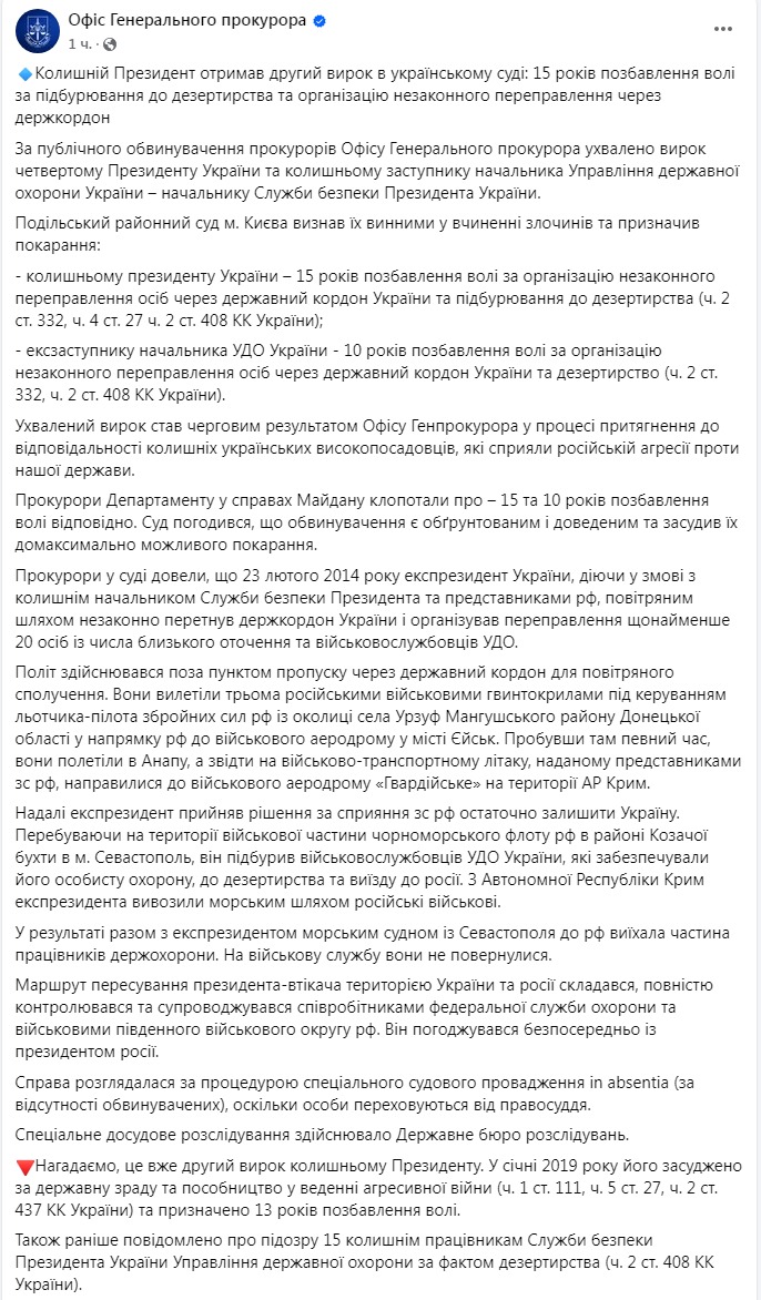 Бывший президент Украины Виктор Янукович получил 15 лет лишения свободы за подстрекательство к дезертирству и организацию незаконной переправки через госграницу.