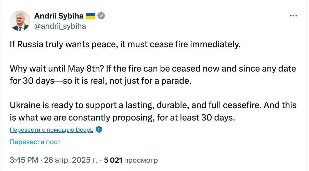 "Если Россия действительно хочет мира, она должна немедленно прекратить огонь. Зачем ждать до 8 мая? Если огонь можно прекратить сейчас и с любой даты на 30 дней — значит, это реально, а не просто для парада. Украина готова поддержать долгосрочное, прочное и полное прекращение огня. И это то, что мы постоянно предлагаем, как минимум на 30 дней", - написал в Х глава МИД Андрей Сибига.