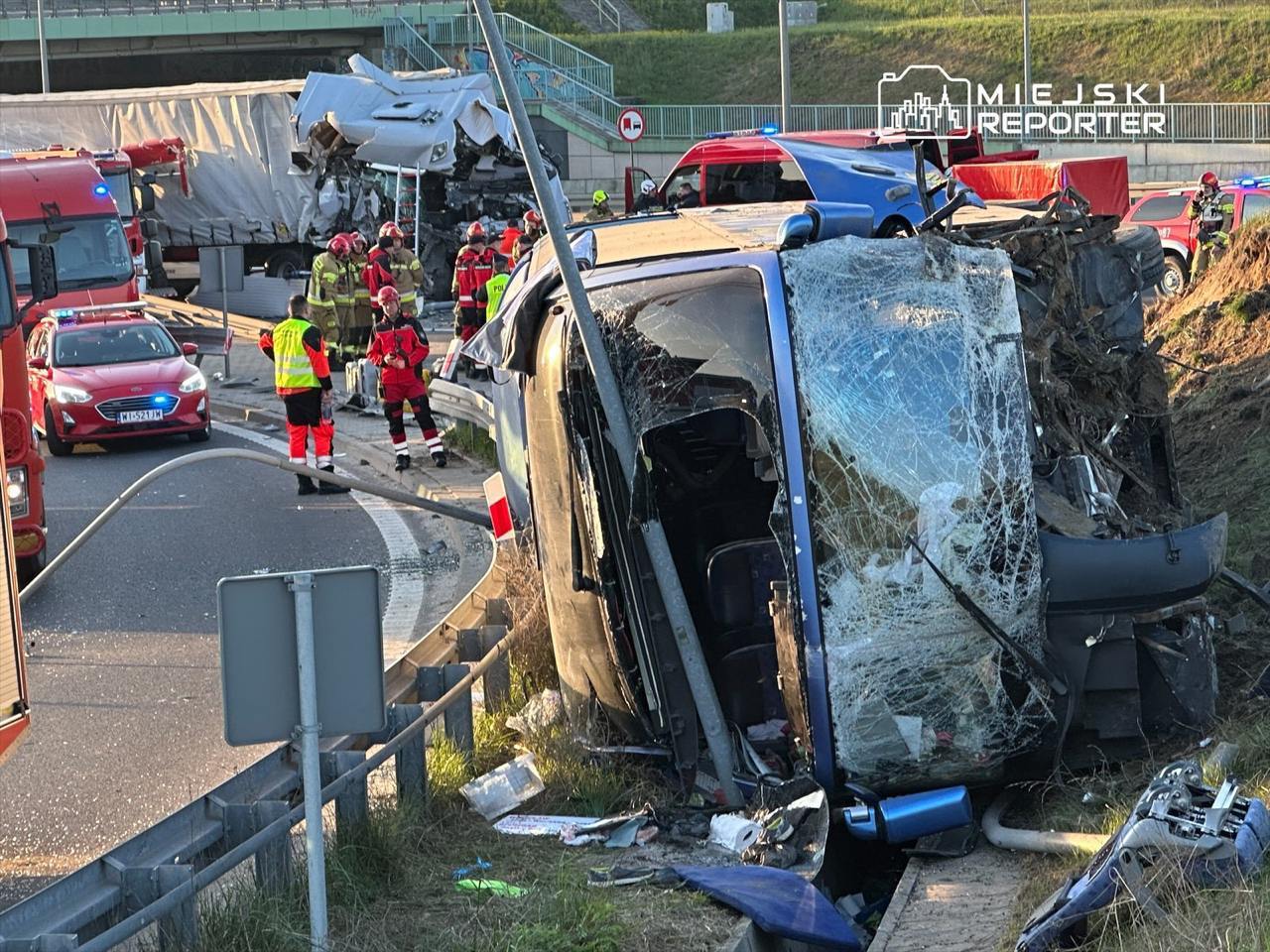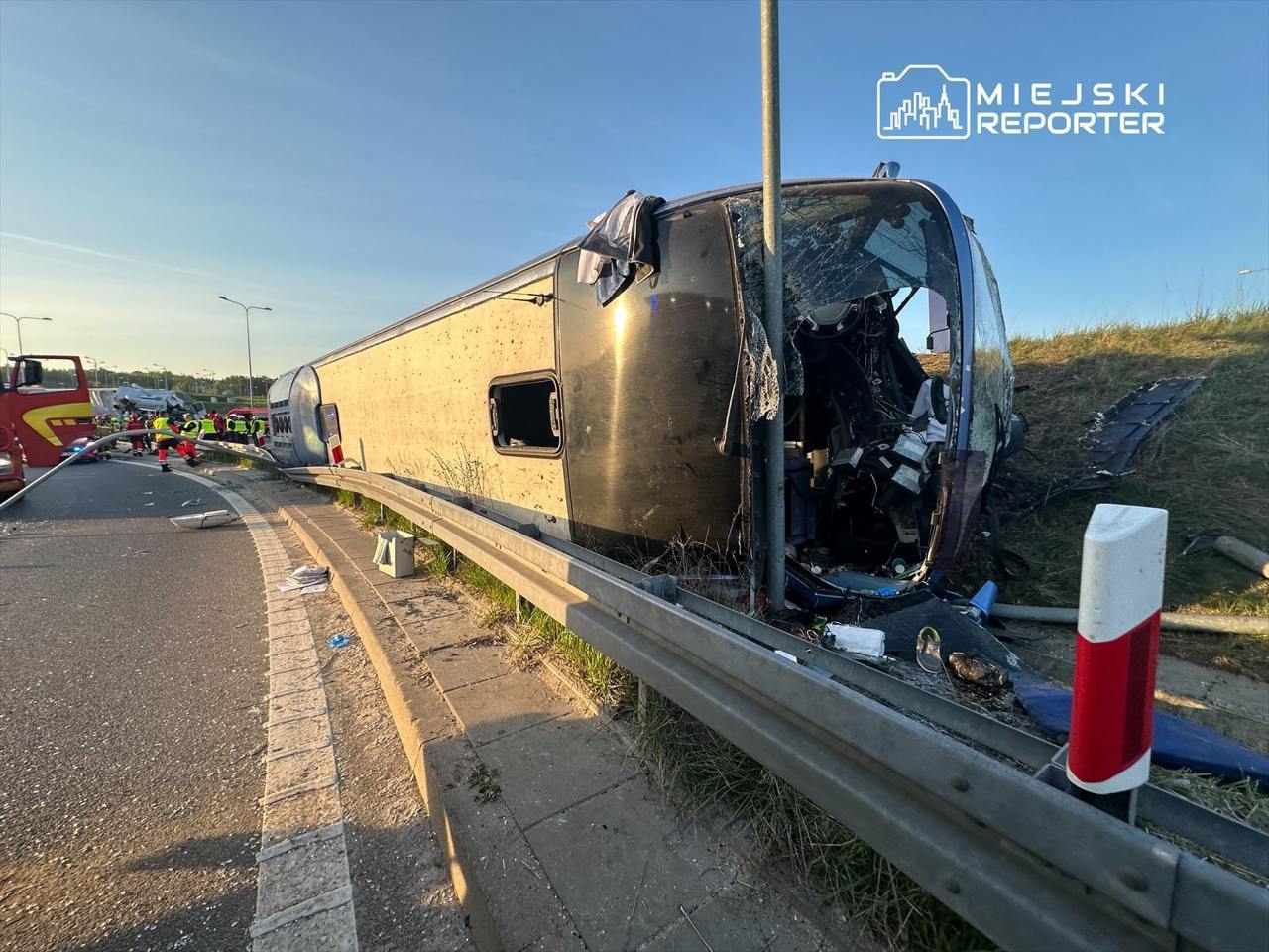 На трассе по направлению в сторону аэропорта Шопена водитель автобуса потерял управление на повороте, после чего влетел в ограждение.