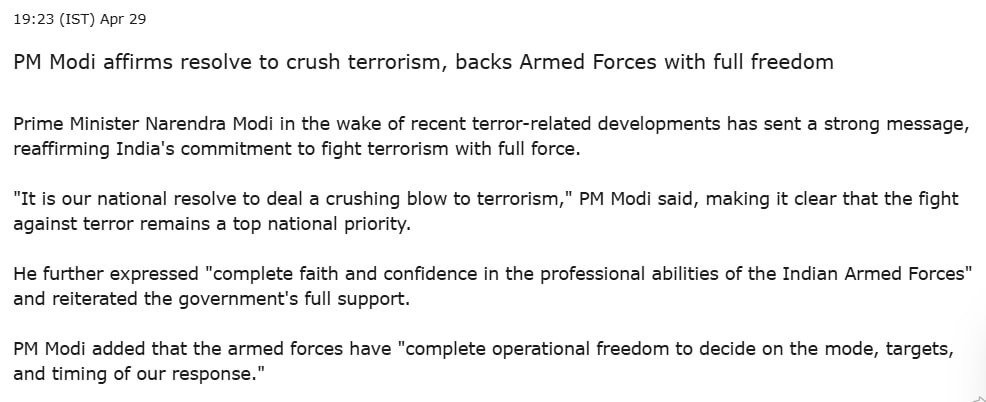 Как пишет газета, Моди выразил "полную веру и уверенность в профессиональных способностях индийских вооруженных сил" и подтвердил полную поддержку правительства. Он также заявил о намерении "сокрушить терроризм".