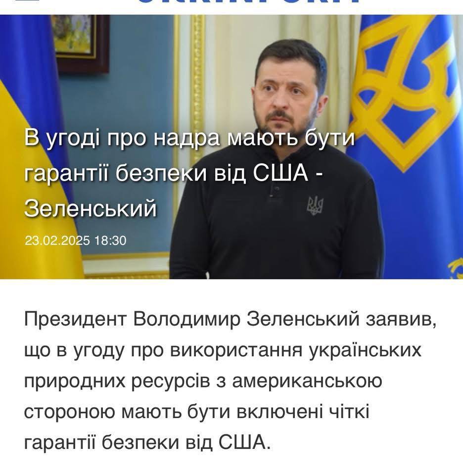 Текст украинско-американской сделки о недрах ещё не опубликован. Но ни в одном комментарии по его поводу ни от Украины, ни от США не упоминается наличие в соглашении гарантий безопасности Украины, на которых ранее настаивал президент Владимир Зеленский (публикуем скрин его заявления от 23 февраля).