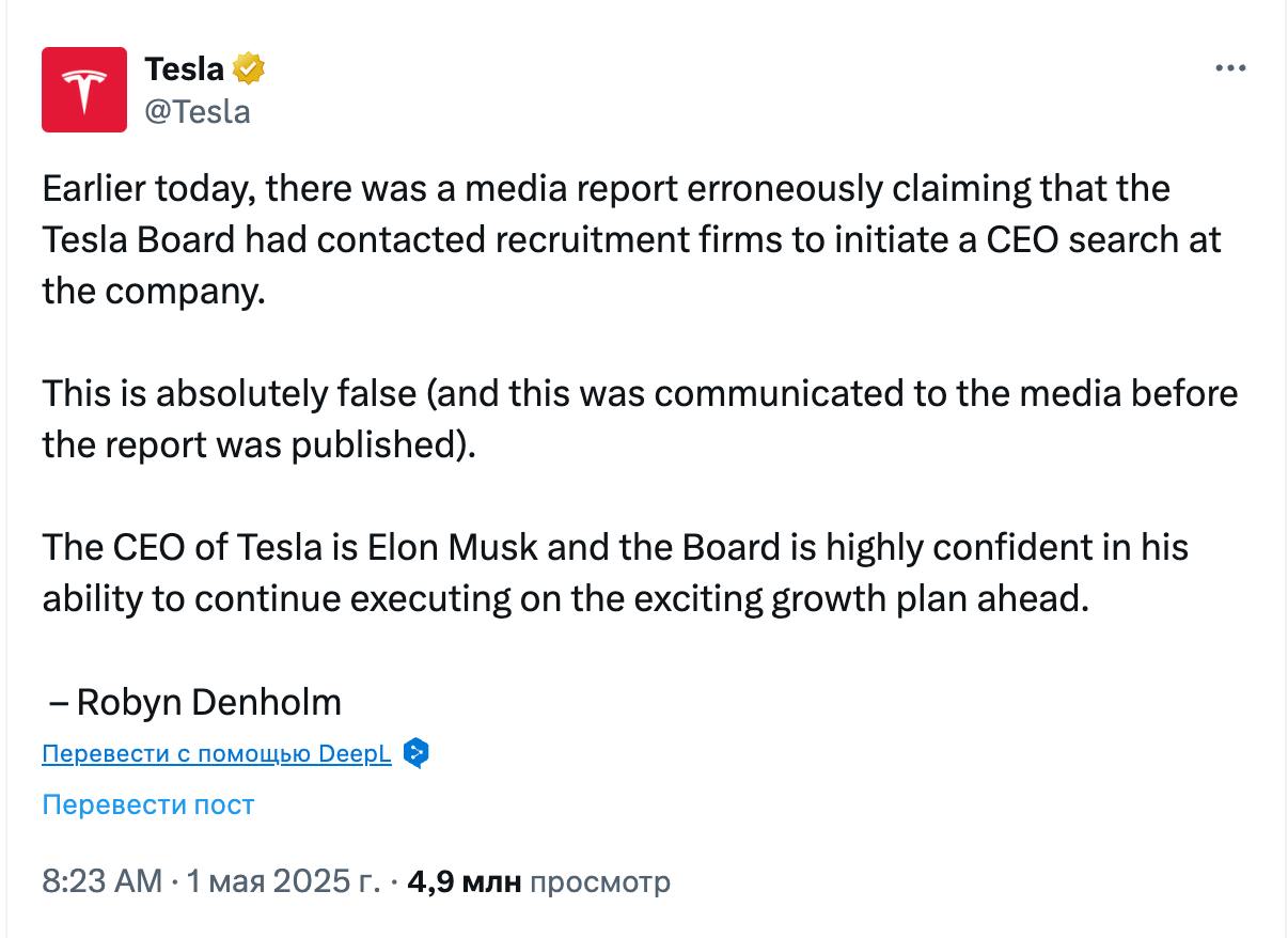 "Ранее сегодня в СМИ появилось ошибочное сообщение о том, что совет директоров Tesla обратился к рекрутинговым компаниям, чтобы начать поиск генерального директора компании. Это абсолютно не соответствует действительности (и об этом было сообщено СМИ до публикации сообщения). Генеральным директором Tesla является Илон Маск, и совет директоров полностью уверен в его способности продолжать реализацию захватывающего плана роста", - заявила глава совета директоров Tesla Робин Денхолм.