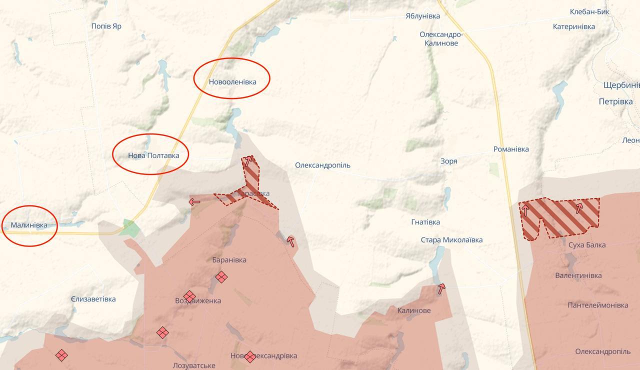 РФ захватила Тарасовку, пытается заходить в Новооленовку севернее и уже заходила в Новую Полтавку по ту сторону трассы. Не исключено, что отдельным солдатам там удалось закрепиться, хотя многие сдались в плен.