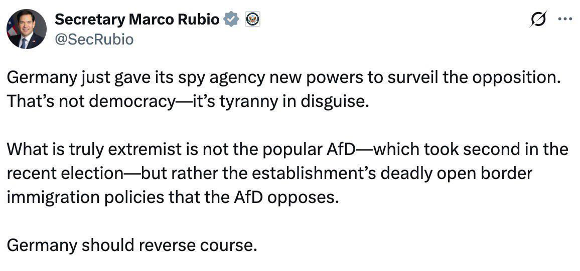 "Германия только что предоставила своему шпионскому агентству новые полномочия для слежки за оппозицией. Это не демократия - это замаскированная тирания. Что действительно является экстремистским, так это не популярная "Альтернатива для Германии", занявшая второе место на недавних выборах, а скорее смертоносная политика открытых границ иммиграции, против которой выступает "Альтернатива для Германии". Германия должна изменить курс", - написал Рубио в своем аккаунте в Х.