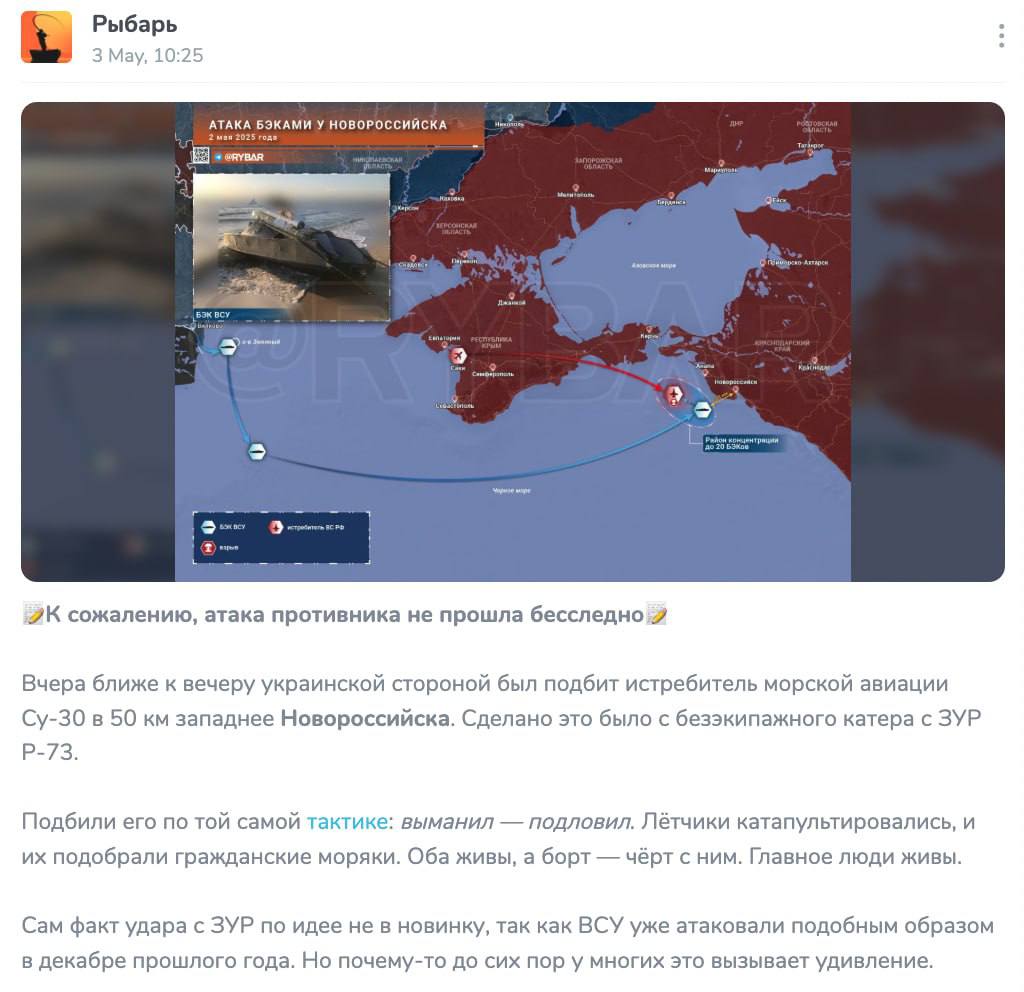 В районе Новороссийска над Черным морем Россия потеряла военный самолёт Су-30, пытаясь уничтожить украинский бэзэкипажный катер во время недавней атаки.