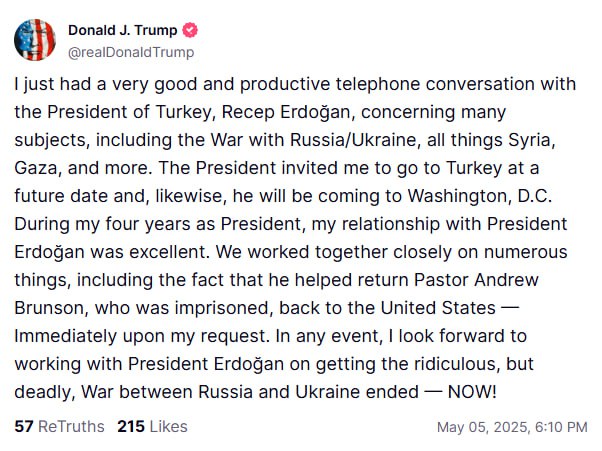 "У меня только что состоялся очень хороший и продуктивный телефонный разговор с президентом Турции Реджепом Эрдоганом на многие темы, включая войну России с Украиной, все, что связано с Сирией, Газой и так далее... Я с нетерпением жду совместной работы с президентом Эрдоганом над окончанием нелепой, но смертоносной войны между Россией и Украиной - сейчас!" – написал Трамп.