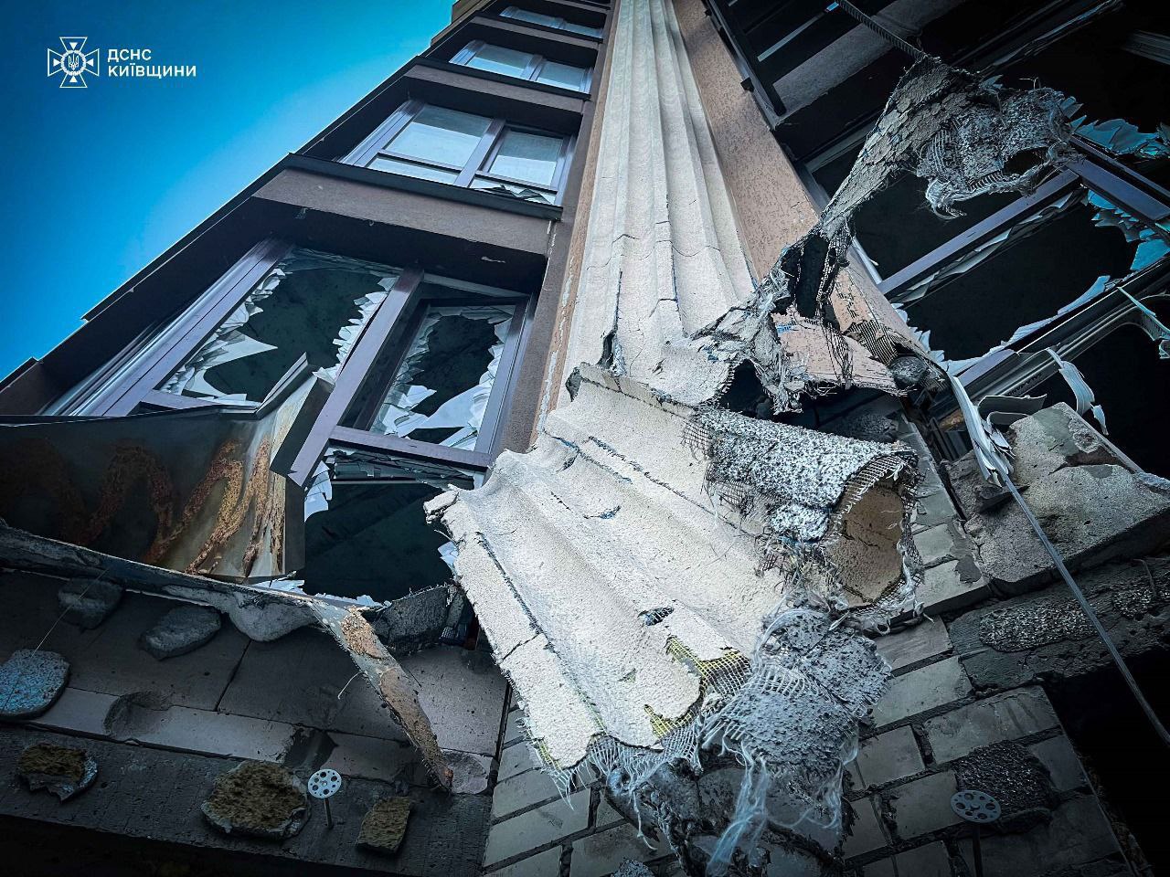 По словам мэра Виталия Кличко, пострадала многоэтажка в Шевченковском районе Киева. На нее упали обломки сбитого беспилотника.