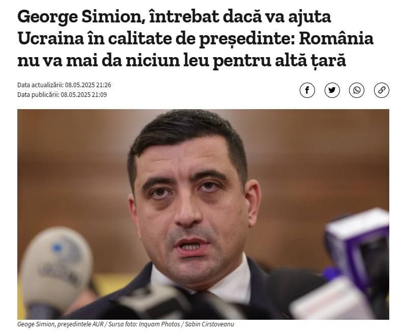 Симион заявил, что Бухарест больше "не даст ни одного цента другой стране". Он ушел от однозначного ответа, будет ли Румыния голосовать за новые пакеты военной поддержки для Украины, но подчеркнул, что его позиция - нейтралитет и согласование решений с политикой американского президента Дональда Трампа.