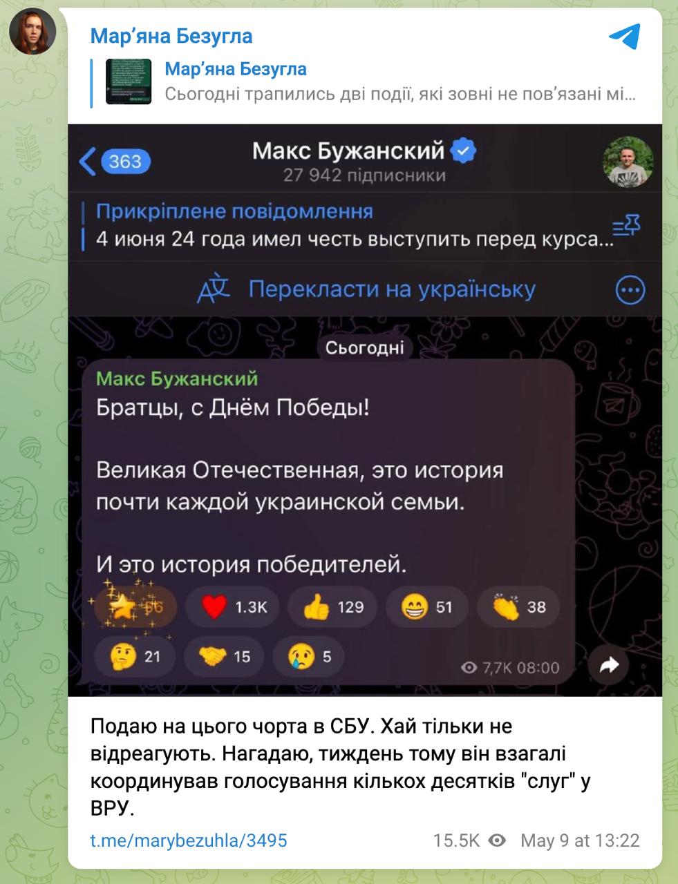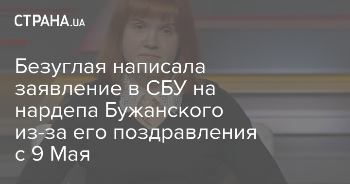 Народный депутат Марьяна Безуглая написала заявление в Службу безопасности Украины на коллегу-парламентария из партии "Слуга народа" Максима Бужанского из-за его поздравления с 9 Мая, в котором он использовал понятие "Великая Отечественная война".