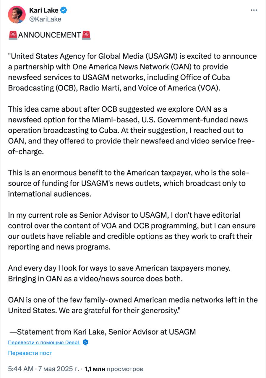 "Это огромная выгода для американских налогоплательщиков, которые являются единственным источником финансирования новостных агентств USAGM, вещающих только на международную аудиторию", - резюмировала Лэйк.