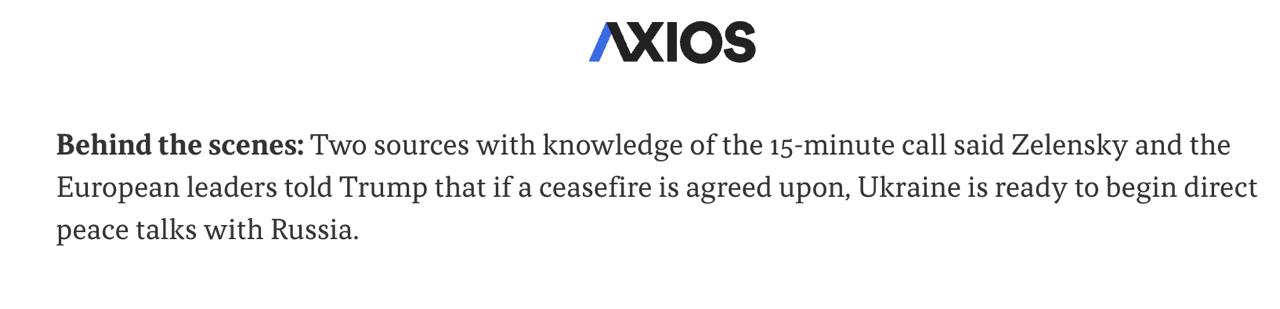 "Два источника, знакомые с 15-минутным разговором, сообщили, что Зеленский и европейские лидеры сообщили Трампу, что если будет достигнута договоренность о прекращении огня, Украина готова начать прямые мирные переговоры с Россией", - говорится в статье.
