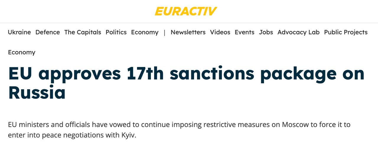 На днях мы писали о том, что в ЕС угрожали России санкциями за отказ от перемирия. При этом СМИ отмечали, что в новые санкции просто добавят больше нефтяных танкеров, и 17-й пакет рестрикций "не будет выходить за рамки" предыдущего.
