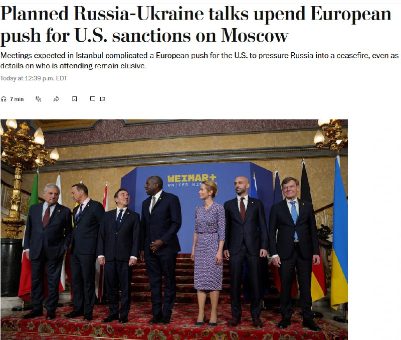Американские и европейские чиновники во вторник вечером отговорили Владимира Зеленского отказываться от переговоров с РФ в Стамбуле после того, как украинский президент заявил, что не разрешит своим помощникам встречаться с российской делегацией в Турции, если туда не приедет Владимир Путин.