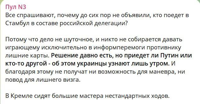 Журналист кремлевского пула Дмитрий Смирнов сообщил, что состав делегации для переговоров с Украиной в Стамбуле Кремль огласит только завтра утром.
