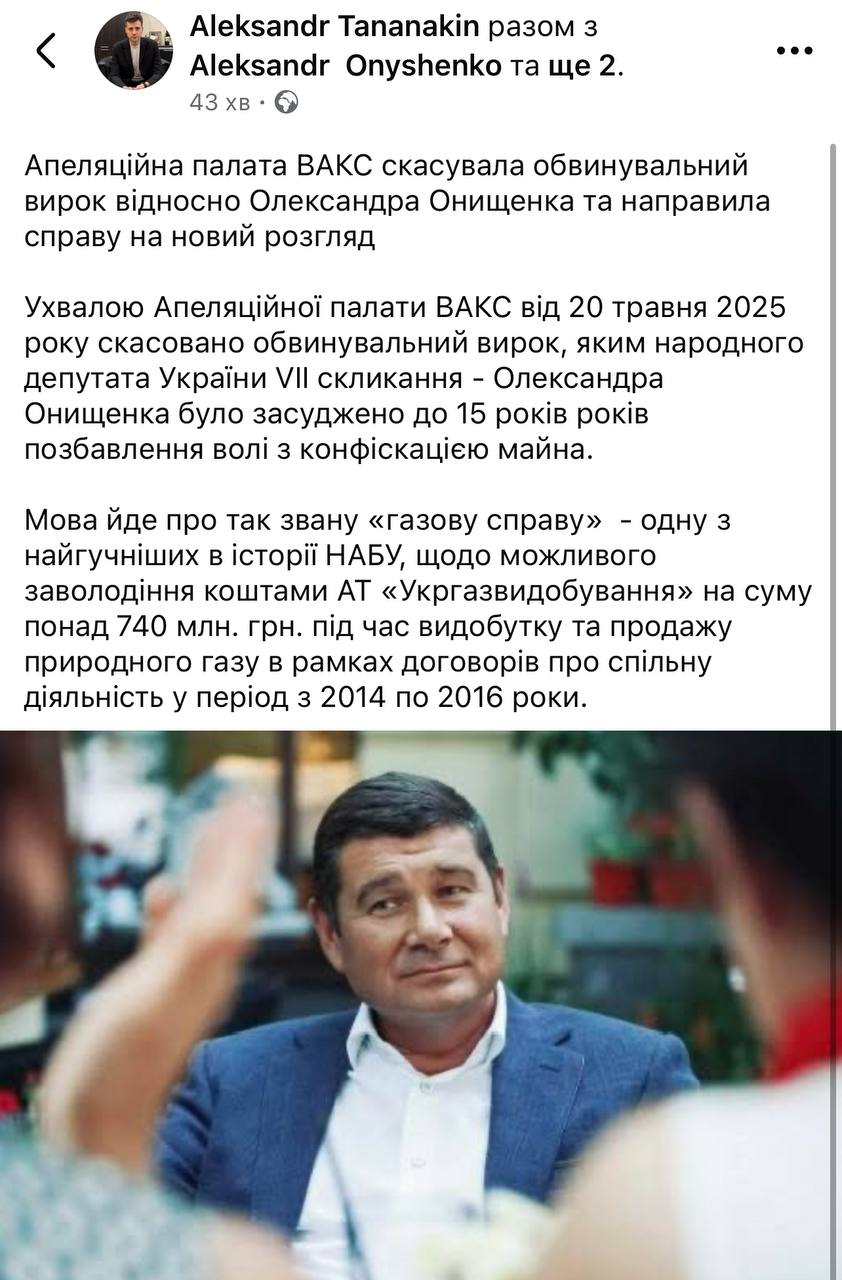 "Постановлением Апелляционной палаты ВАКС от 20 мая 2025 года отменён обвинительный приговор, согласно которому народный депутат Украины VII созыва - Александр Онищенко - был приговорён к 15 годам лишения свободы с конфискацией имущества", - написал Тананакин.