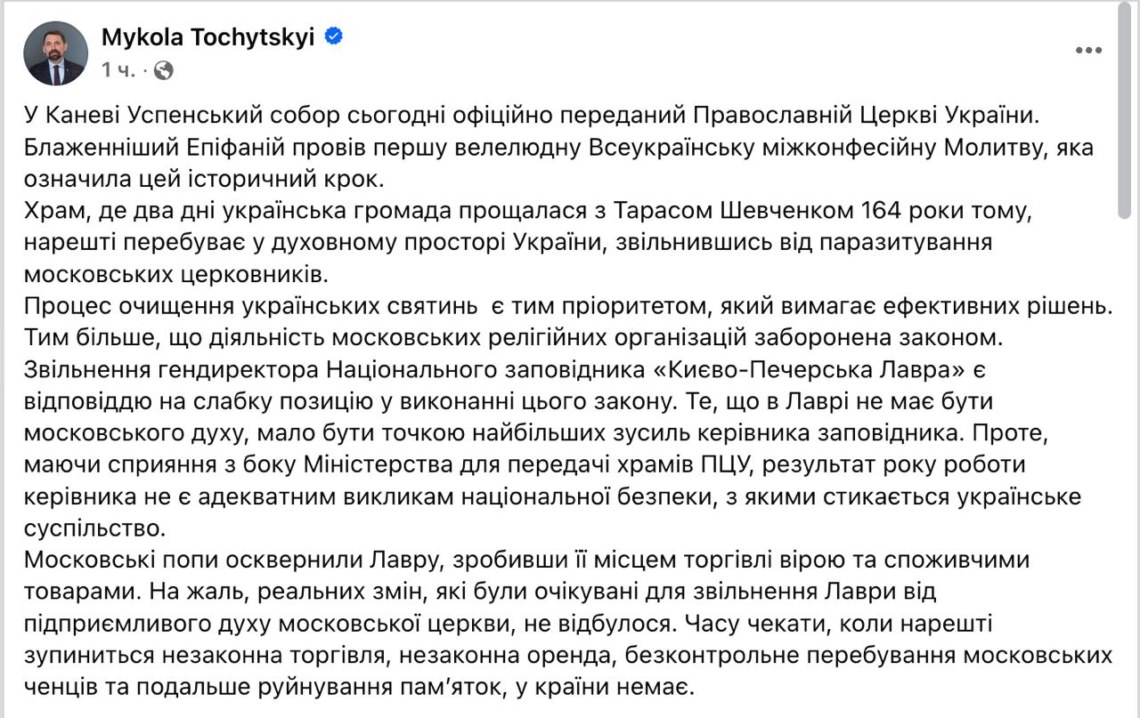 "Процесс очищения украинских святынь является приоритетом, который требует эффективных решений. Тем более что деятельность московских религиозных организаций запрещена законом. Увольнение гендиректора Национального заповедника "Киево-Печерская лавра" является ответом на слабую позицию в исполнении этого закона. То, что в лавре не должно быть московского духа, должно быть точкой наибольших усилий руководителя заповедника. Однако при содействии со стороны министерства для передачи храмов ПЦУ результат года работы руководителя не является адекватным вызовам национальной безопасности, с которыми сталкивается украинское общество", - написал Точицкий.