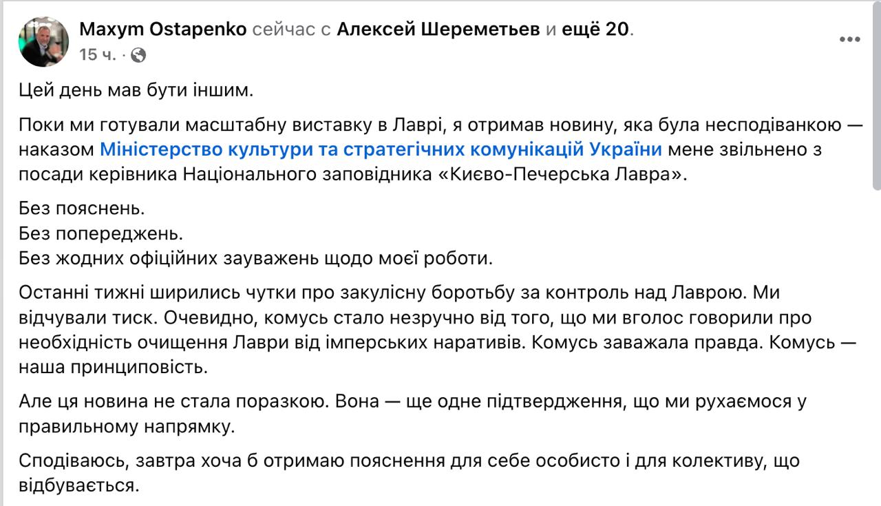 "Последние недели ходили слухи о закулисной борьбе за контроль над лаврой. Мы ощущали давление. Очевидно, кому-то стало неудобно оттого, что мы вслух говорили о необходимости очищения лавры от имперских нарративов. Кому-то мешала правда. Кому-то наша принципиальность", - написал он.