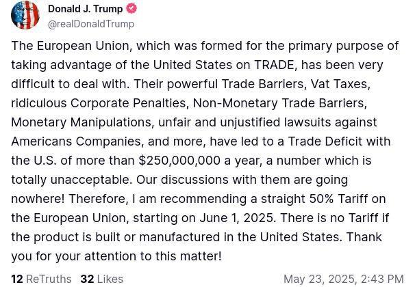 "Европейский Союз, который был создан с основной целью извлечения выгоды из торговли с США, оказался очень сложным партнером. Их мощные торговые барьеры, налоги на добавленную стоимость, нелепые корпоративные штрафы, немонетарные торговые барьеры, манипуляции с валютой, несправедливые и необоснованные судебные иски против американских компаний и многое другое привели к торговому дефициту с США в размере более 250 000 000 долларов в год, что является совершенно неприемлемым. Наши переговоры с ними ни к чему не приводят! Поэтому я рекомендую ввести прямые пошлины в размере 50% на товары из Европейского союза с 1 июня 2025 года. Пошлины не будут взиматься с товаров, произведенных в США", - написал Трамп.