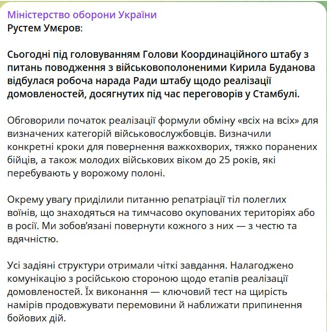 "Обсудили начало реализации формулы обмена "всех на всех" для определенных категорий военнослужащих. Определили конкретные шаги по возвращению тяжелобольных, тяжело раненых бойцов, а также молодых военных до 25 лет, находящихся во вражеском плену. Отдельное внимание было уделено вопросу репатриации тел павших воинов, находящихся на временно оккупированных территориях или в России", – рассказал министр.