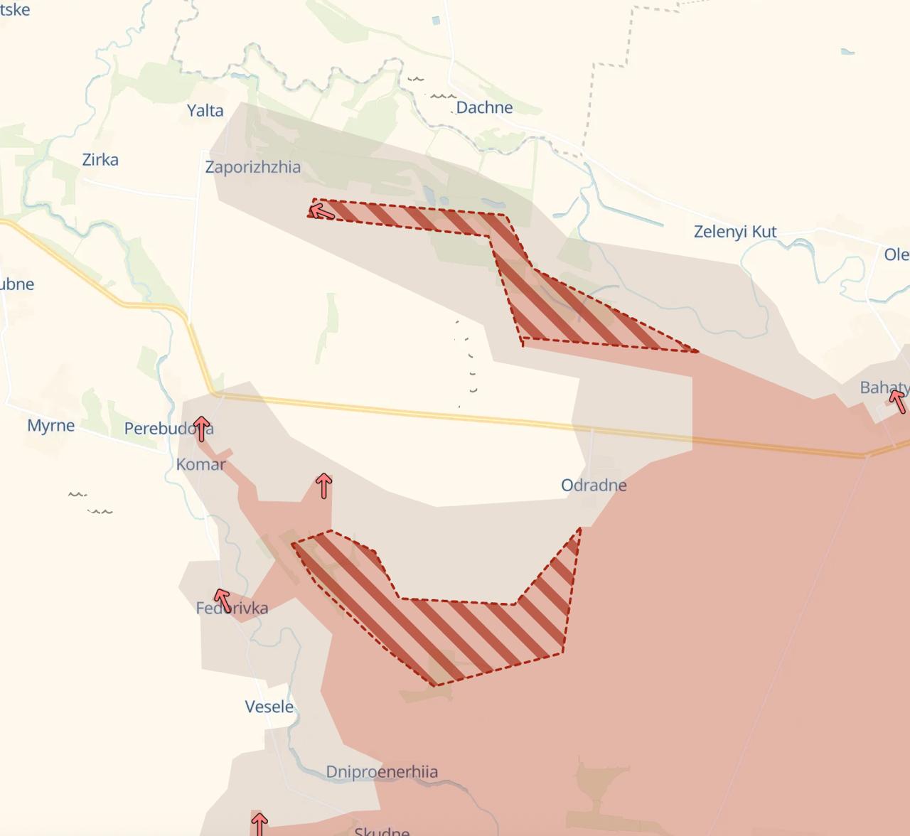 Южнее у РФ зафиксировано продвижение в районе Комара и Отрадного, что образовывает "мешок" вдоль трассы на Запорожскую область.