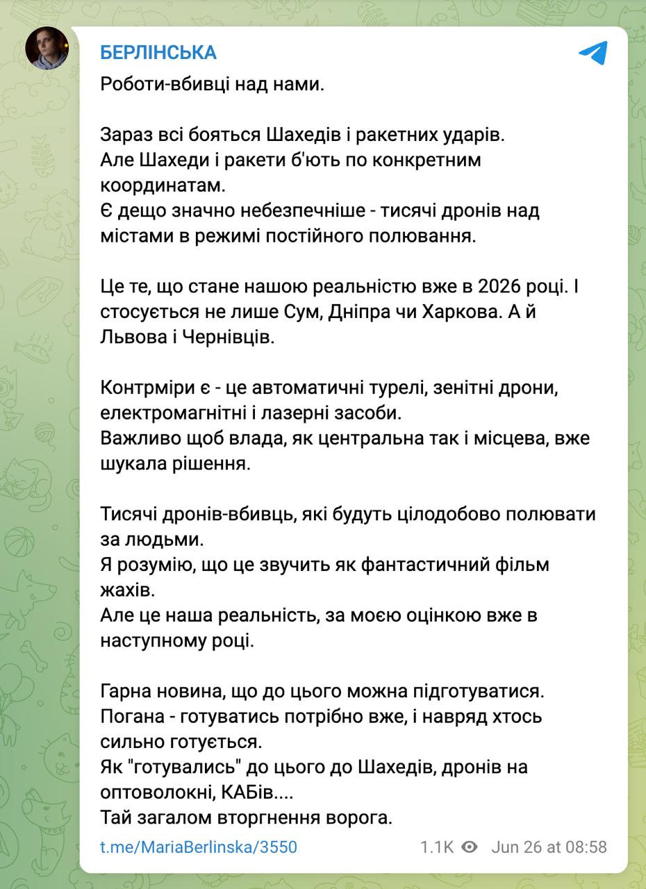"Тысячи дронов-убийц, которые будут круглосуточно охотиться за людьми. Я понимаю, что это звучит как фантастический фильм ужасов. Но это наша реальность, по моей оценке, уже в следующем году. И касается не только Сум, Днепра или Харькова. Но и Львова и Черновцов", - пишет Берлинская.