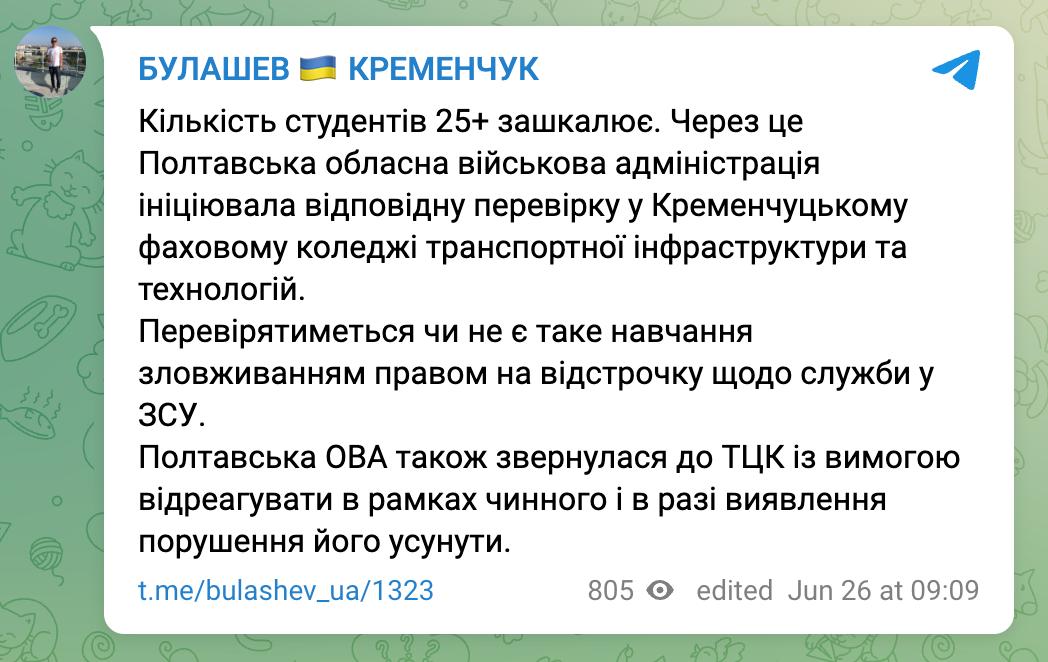 "Будет проверяться, не является ли такое обучение злоупотреблением правом на отсрочку от службы в ВСУ. Полтавская ОГА также обратилась к ТЦК с требованием отреагировать в рамках действующего законодательства и в случае выявления нарушения его устранить", - пишет Булашев.