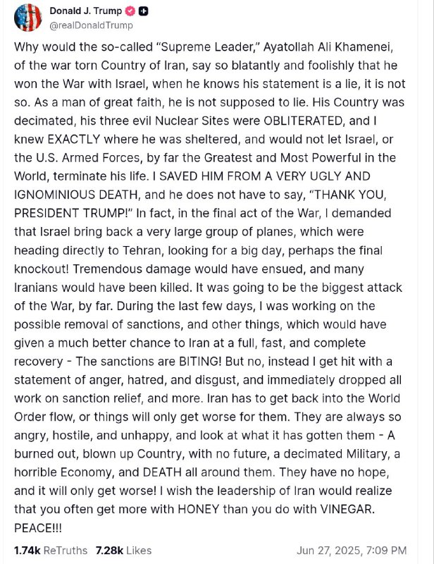 "В последние дни я работал над возможным снятием санкций и другими шагами, которые могли бы дать Ирану шанс на быстрое, полное и успешное восстановление – санкции действительно бьют больно! Но вместо этого я получаю заявление, полное злобы, ненависти и отвращения – и немедленно прекращаю всю работу над санкционным послаблением и другими мерами. Иран должен вернуться в русло мирового порядка, иначе всё станет только хуже. Они всегда такие злые, враждебные и несчастные — и что это им дало? Выжженная, разбомблённая страна без будущего, с разгромленной армией, рухнувшей экономикой и смертью повсюду. У них нет надежды - и ситуация будет только ухудшаться. Я хотел бы, чтобы руководство Ирана поняло: с мёдом добьёшься гораздо большего, чем с уксусом", – сказано в публикации.