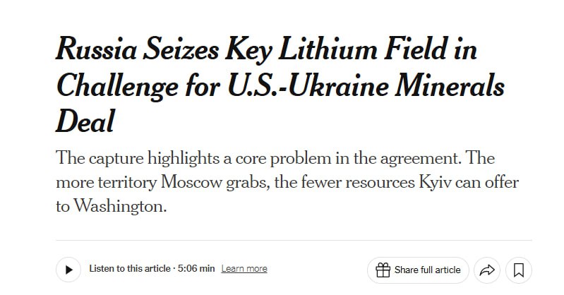Продвижение армии РФ лишает Украину месторождений редкоземельных металлов из ресурсной сделки c США - NYT