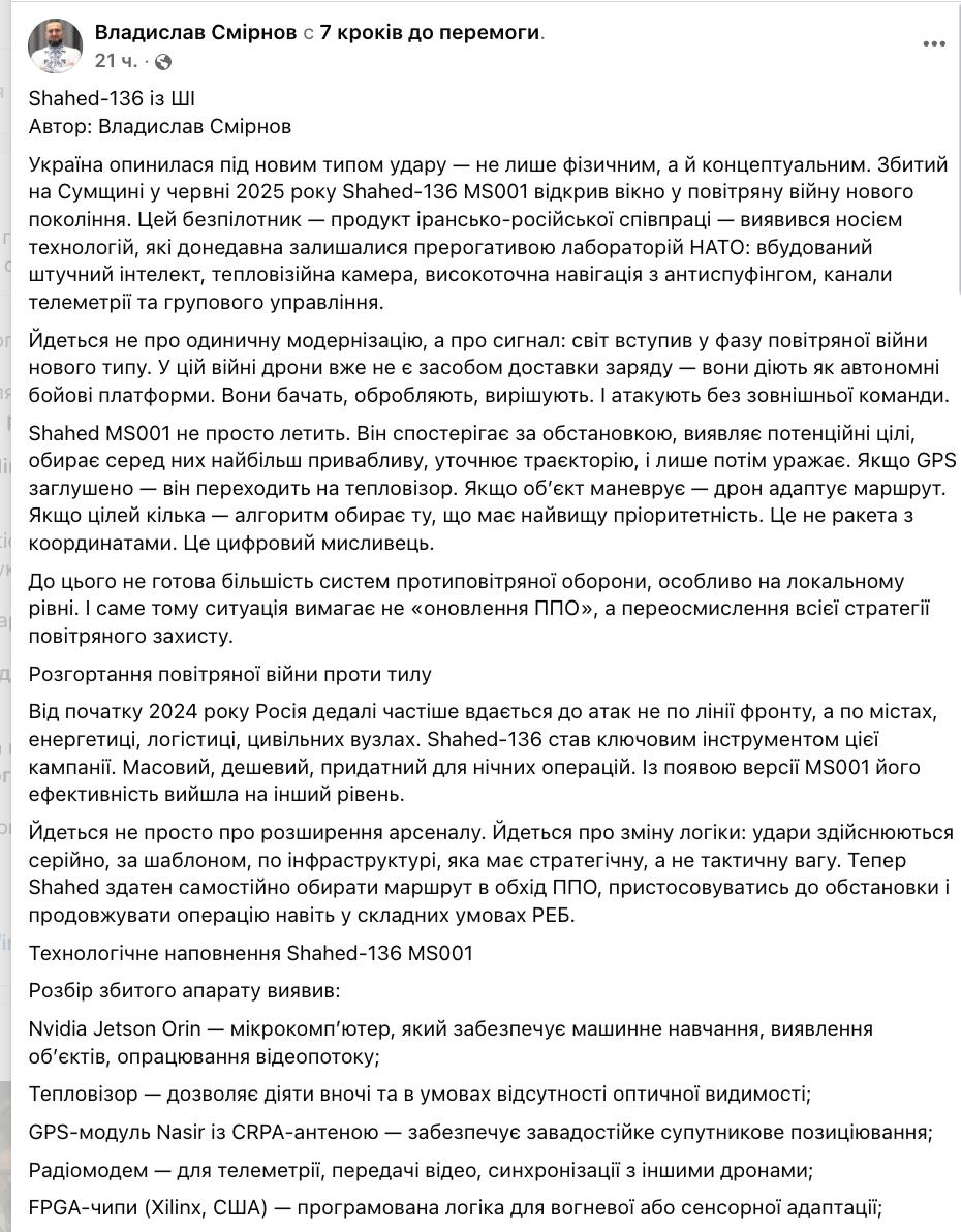 По его словам, это модель Shahed-136 MS001, который "стал сигналом начала воздушной войны нового поколения".