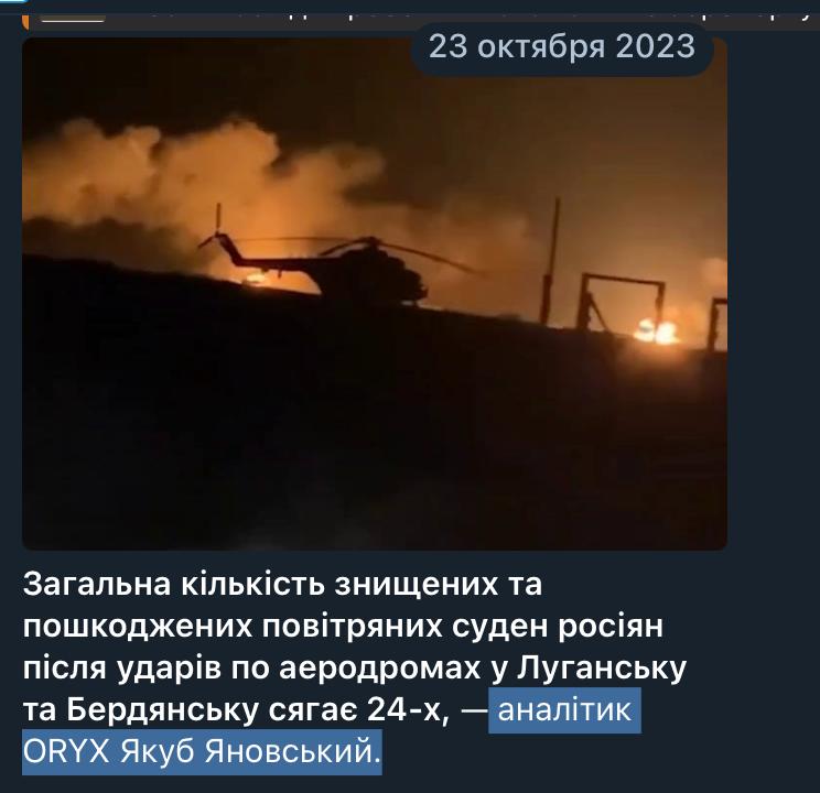 Однако этот ролик старый и на самом деле снят в октябре 2023 года. На кадрах, как тогда писали СМИ - последствия удара ракет ATACMS по российским вертолетам в Бердянске.