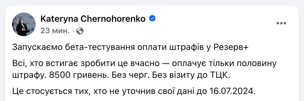 Благодаря этому военнообязанные, которые не обновили свои данные до 16 июля 2024 года, имеют возможность зарегестрироваться и оплатить только половину штрафа – 8,5 тысяч грн.