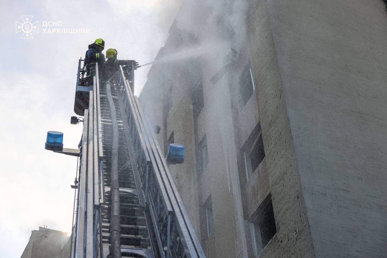 По заявлениям местных властей, в Шевченковском районе есть попадание в многоэтажный жилой дом, один из этажей охвачен огнем.