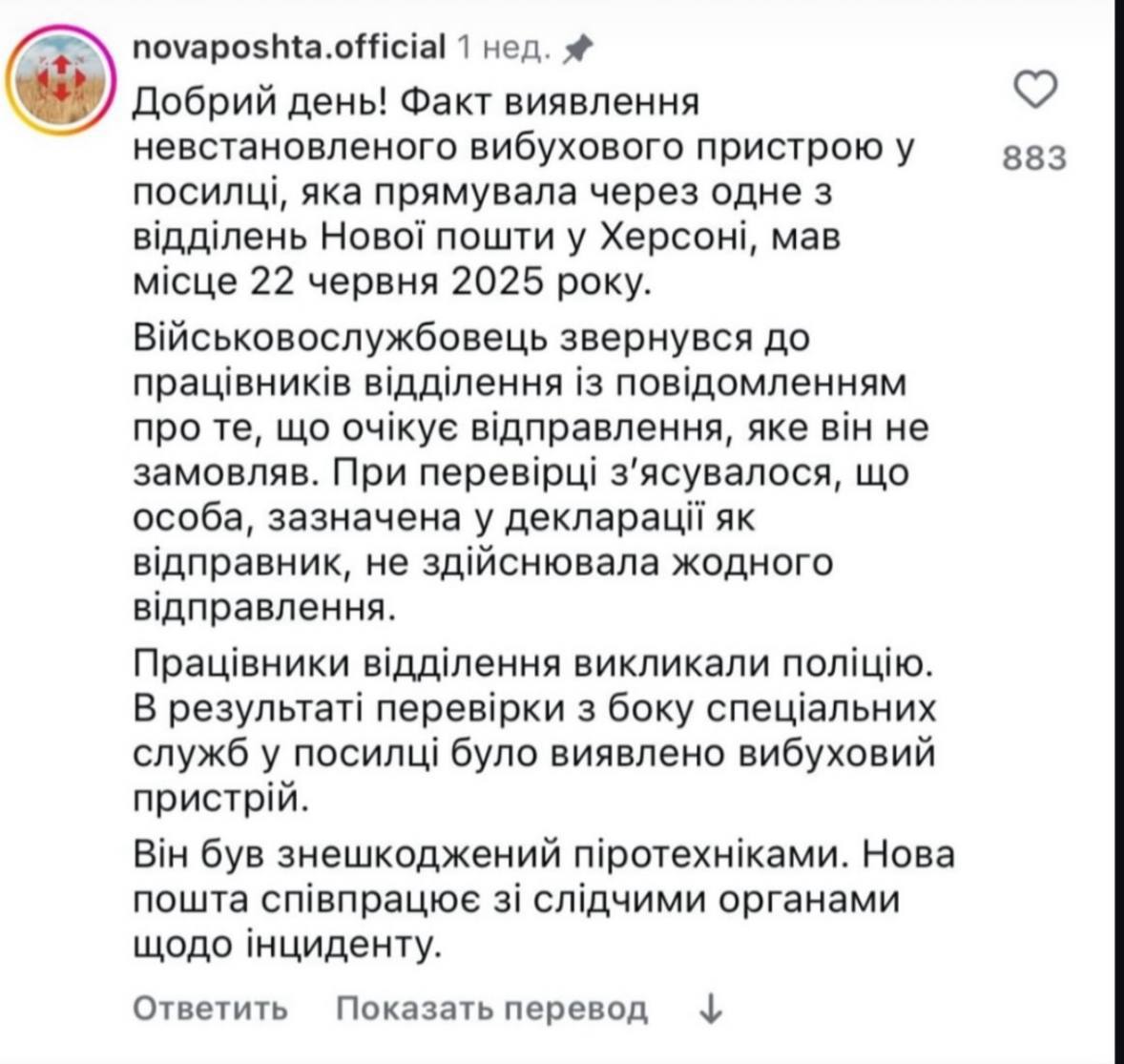 По ее информации, инцидент произошел 22 июня в Херсоне: военный обратился к сотрудником "Новой почты" и сказал, что ему пришло уведомление о посылке, которую он не ждал. При проверке выяснилось, что указанный в данных отправитель тоже ничего не отправлял. Полиция и спецслужбы при обследовании посылки установили, что в ней находилась взрывчатка. Ее уничтожили пиротехники.