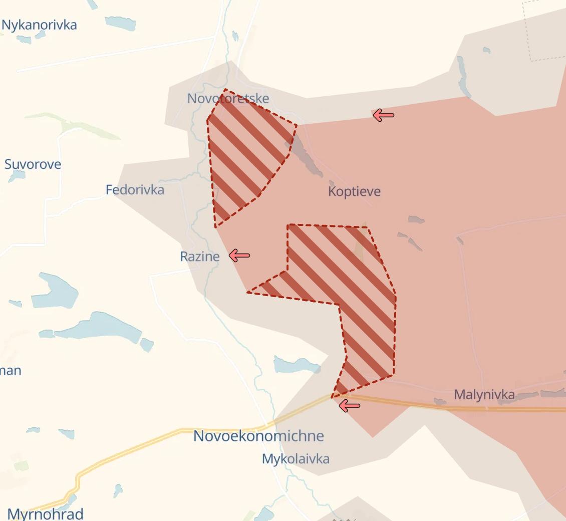 Крупное продвижение РФ зафиксировано и к северо-востоку от Покровска и Мирнограда (по линии Новоторецкое - Новоэкономическое). Там враг вероятно совершает попытки выйти к северу от Покровска.