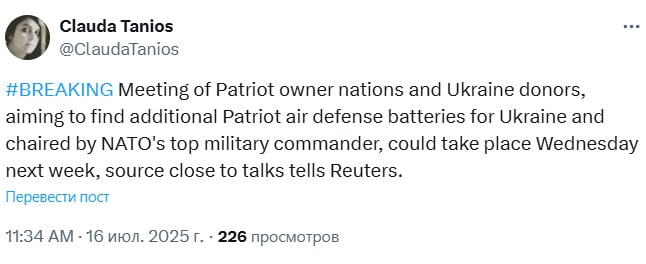 "Встреча стран - владельцев ракет Patriot и стран - доноров Украины, целью которой является поиск дополнительных батарей ПВО Patriot для Украины, под председательством главнокомандующего войск НАТО может состояться в среду на следующей неделе, сообщил агентству Reuters источник, близкий к переговорам", - написала Таниос.