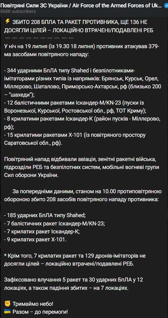 - 344 ударных БПЛА типа Shahed и беспилотниками-имитаторами (из них сбито или локационно потеряно 304);