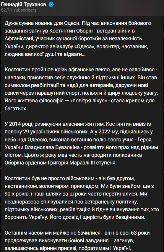 13:39 Во время выполнения боевого задания погиб украинский лётчик, директор авиаклуба "Одесса" Константин Оборин. Об этом сообщил мэр Одессы Геннадий Труханов.