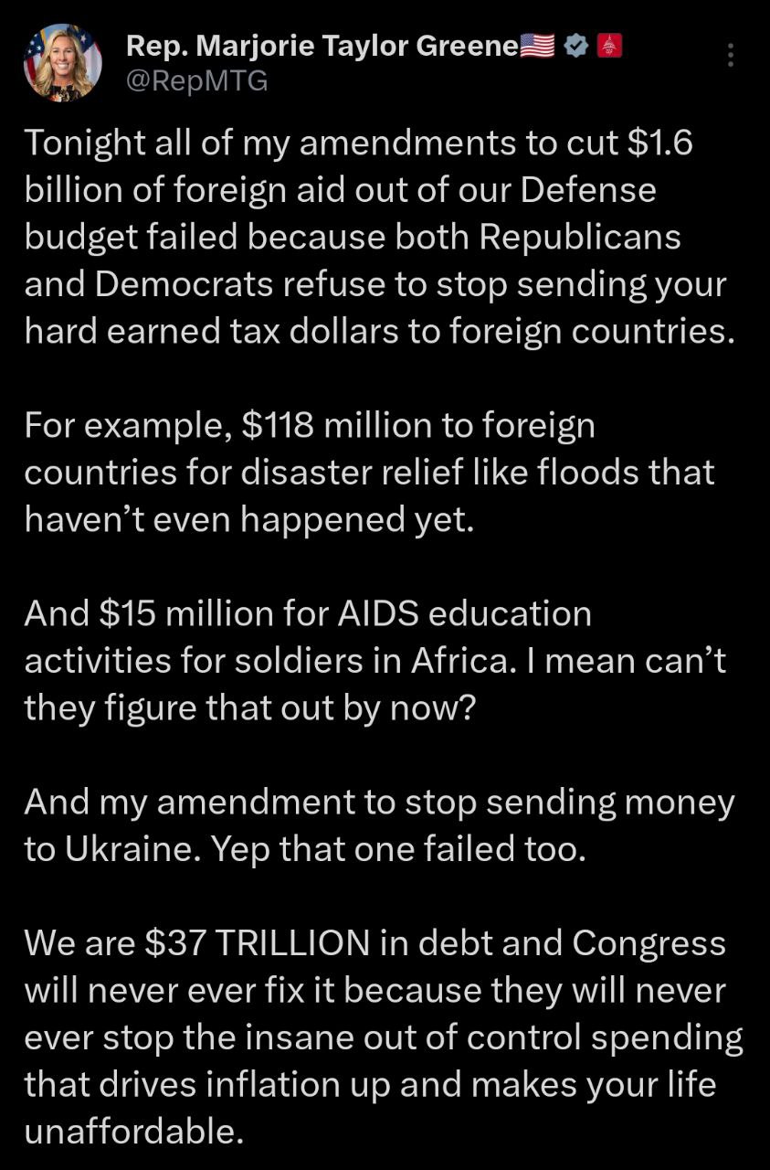Об этом сообщила поддерживающая MAGA конгрессмен Марджори Тейлор Грин, которая подала соответствующую правку.