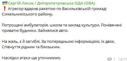 13:25 В результате удара по Синельниковскому району Днепропетровской области есть погибшие, сообщает ОВА.