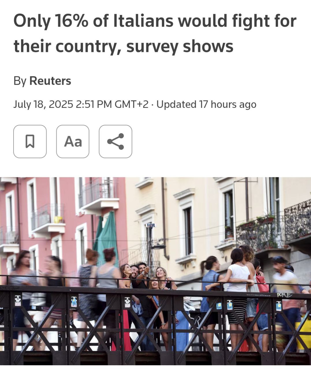 Только 16% опрошенных итальянцев призывного возраста готовы взяться за оружие в случае наступления войны.