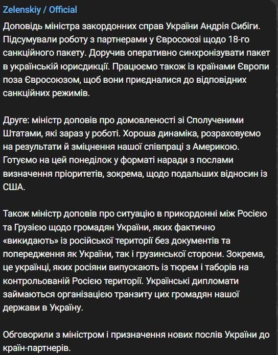 Также президент сообщил, что обсудил с Сибигой назначение новых послов Украины в страны-партнеры, а также работу с партнерами в Евросоюзе по 18-му санкционному пакету против РФ.