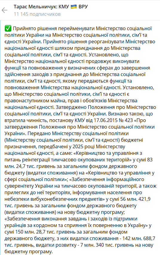 Минединства присоединили к Минсоцполитики, сообщает Мельничук. Теперь его полное название - Министерство социальной политики, семьи и единства Украины.