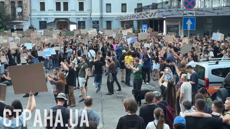В Киеве протестующие против закона об урезании полномочий НАБУ и САП скандируют "Ганьба!" ("Позор!").