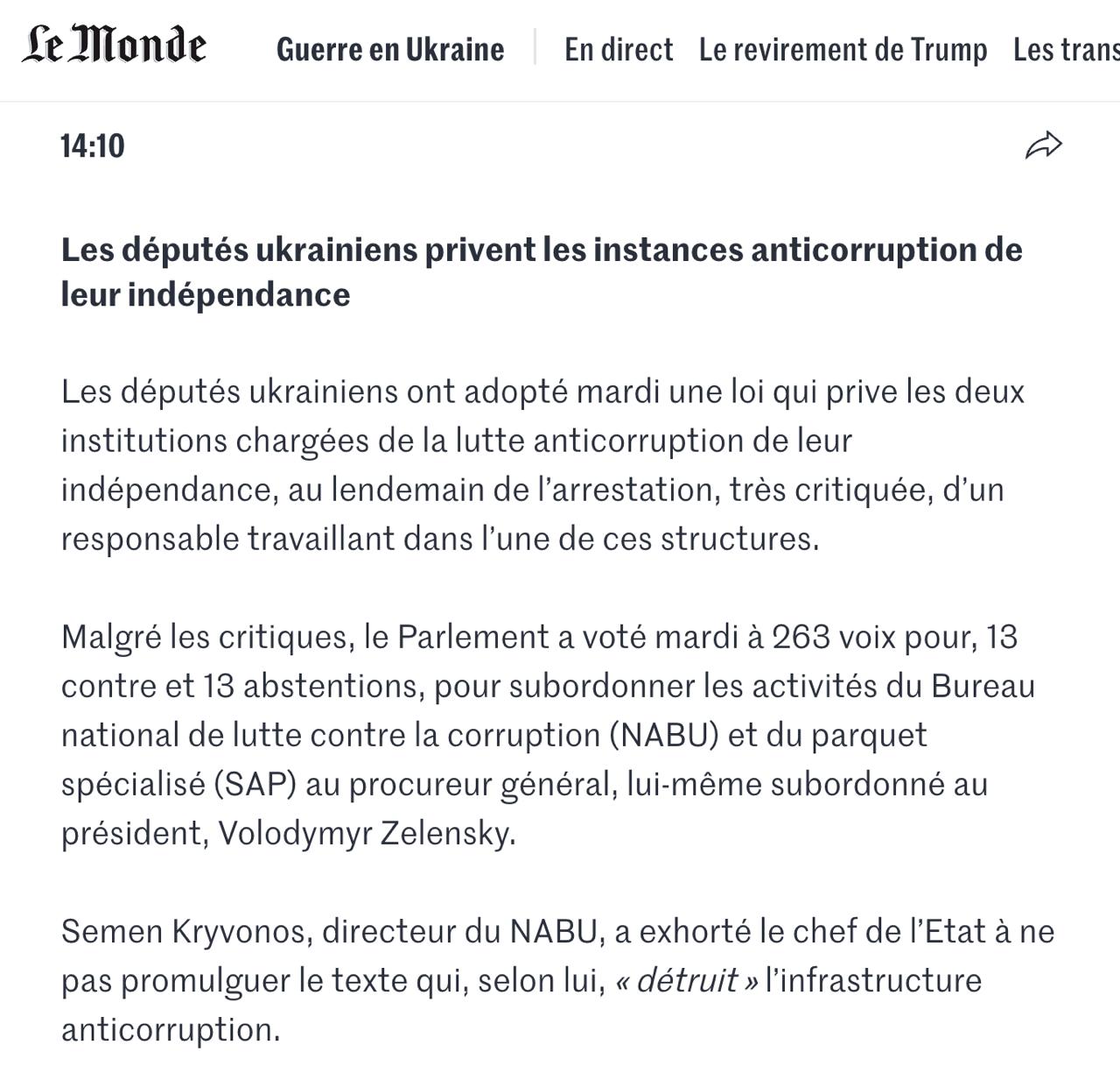 А французская Le Monde полагает, что "украинские депутаты лишают антикоррупционные органы независимости" после "резкой критики ареста чиновника, работавшего в одном из этих органов".